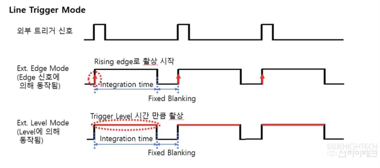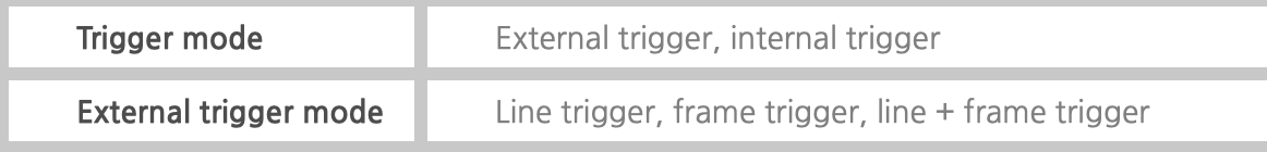 일반적으로 라인스캔 카메라는 트리거모드를 internal/ external 모드를 제공하며, external mode는 lien trigger, frame trigger, line + frame trigger를 제공합니다.