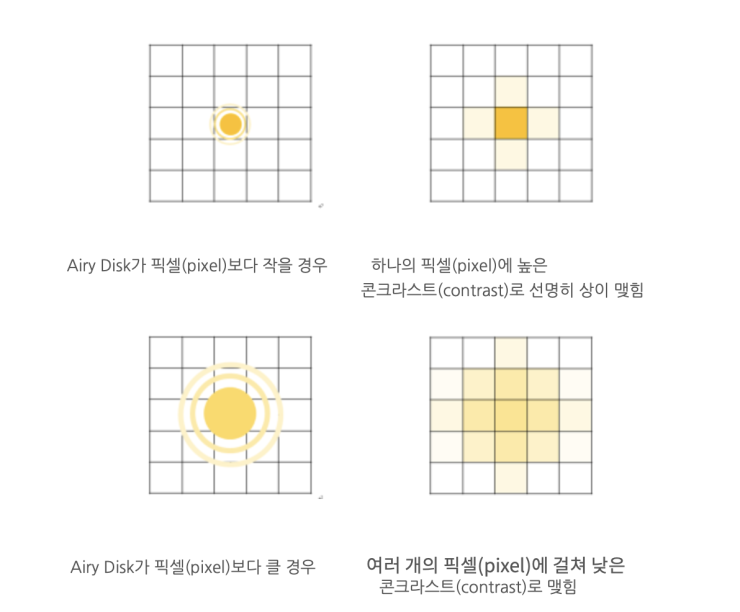 예를들어, 첫번째 원이 작으면 물체단의 빛을 좀 더 정밀하게 센서로 전달할 수 있다는 의미이고, 반대로 이원이 크면 렌즈는 물체단의 빛을 부정확하게 센서로 전달한다는 의미입니다. 아래 그림과 같이 airy disk의 크기로 인해 센서에서 나타나는 결함의 형상은 선명하게도, 흐릿하게도 표면될 수 있습니다.