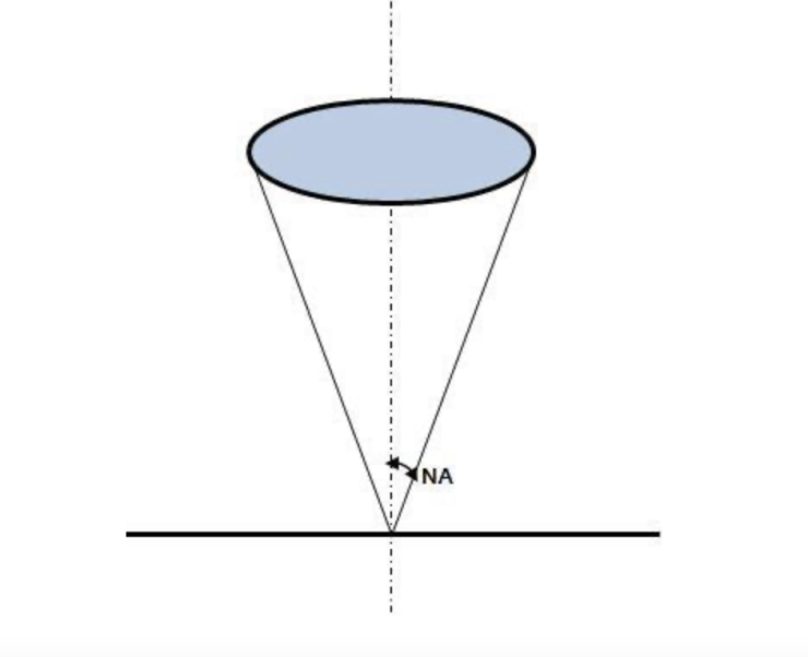 또한 회절 현상은 빛이 통과하는 틈이 작을수록 잘 발생하기 때문에 조리개의 크기가 작아질수록 빛은 더 크게 꺾여 airy disk를 크게 만듭니다. 조리개의 크기와 관계가 있는 항목 중 하나는 N/A(numerical aperture)입니다. 더 작은 크기의 조리개를 통과할 때 빛의 회절이 잘 발생하는 것처럼 NA 값이 클때 입사되는 점광원에 대한 회절이 더 작게 발생합니다.