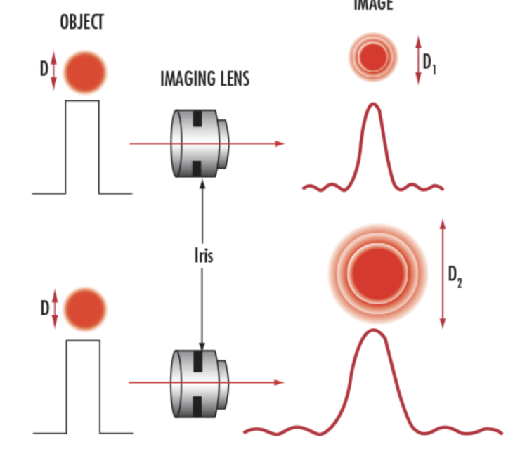 빛이 임의의 크기를 가진 동그란 aperture를 통과하면 빛이 퍼지며 회절과 간섭이 발생하는데, 이로인해 동그란 형태의 빛이 아닌 Airy Disk 라는 동심원의 간섭무늬를 형성하게 됩니다. Airy disk의 중심에 있는 가장 밝은 원이 전체 광원의 84%의 광량을 차지하고 그 주위에 어둡고 밝은 원반들이 차례로 나타납니다. 그리고 중심에 있는 가장 밝은 원이 렌즈의 해상력을 결정하는 주요한 요인이 됩니다.
