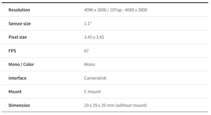 Sensor size 1.1 inch에 pixel size 3.45um*3.45um, 해상도 4096*3000 인 것을 확인할 수 있습니다.