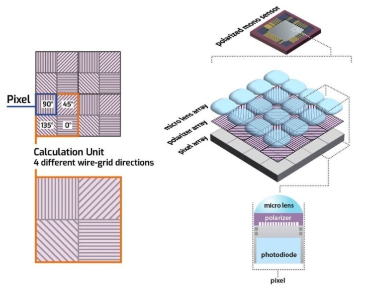 편광기 배열은 각 픽셀에 배치된 4개의 다른 각도의 편광기(0도, 45도, 90도, 135도)로 구성되어 있습니다..