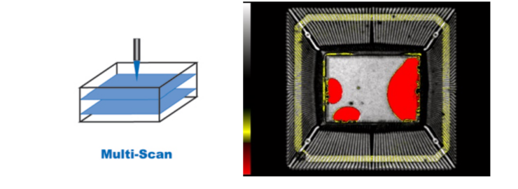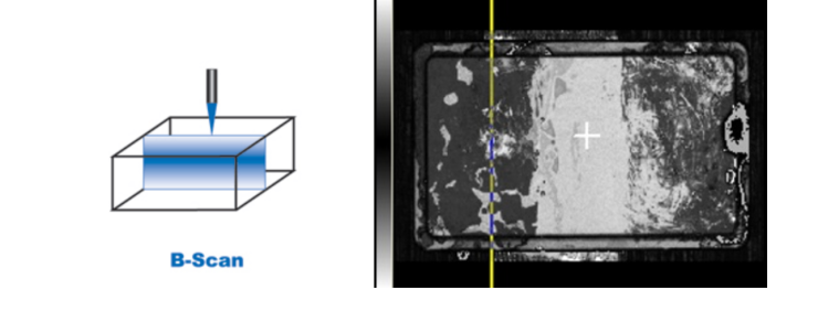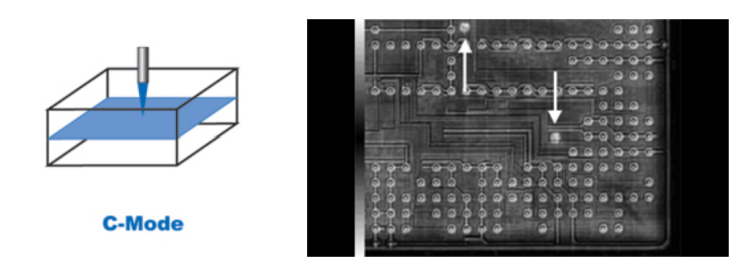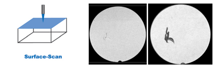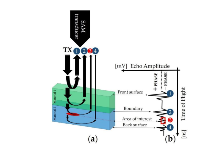 초음파는 공기 공간 유형의 결함(균열, 박리, 보이드 등에 대한 민감도가 높기 떄문에 샘플 표면 검사에서 또한 유리합니다. 결함이 위치한 영역에서 높은 대비를 보입니다.