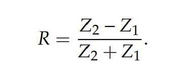 반사되어 돌아오는 초음파의 정도를 뜻하는 진폭(Echo Amplitude)은 검사대상을 구성하는 각각의 물질의 음향임피던스로 결정되는 반사계수 R로 계산할 수 있습니다.