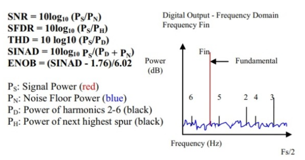 SNR은 signal to Noise Ratio의 약자로 ADC의 SNR은 아래 그림에서 진폭이 가장 높은 빨간색의 fundamental 신호와 파란색 noise floor의 비로 정의됩니다. 이때 fundamental 전압신호(carrier)와 hamonics 시놓를 제외하고 noise floor를 계산합니다.