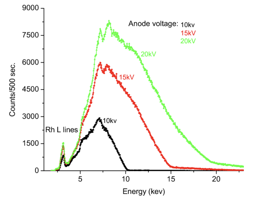 tube operation 전압이 높아지면 X-Ray output range가 비례하여 높아지게 됩니다. 따라서 x-ray tube의 voltage range는 검사 가능한 에너지 스펙트럼의 범위를 결정하며, voltage range는 시료의 두께 및 성분에 따라 결정해야합니다.