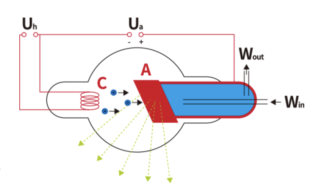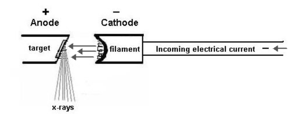 필라멘트에 고전압을 가하면 전류가 흐르면서 가열되는데, 가열된 필라멘트에서 에너지를 얻은 열전자가 tube로 방출되게 됩니다. 고전압으로 가속된 전자는 양극 전극인 금속판에 충돌하는데 이 때 전자가 가지고 있던 운동에너지가 빛에너지와 열에너지로 전환됩니다. 전자의 운동에너지가 빛에너지로 바뀐것이 X-Ray입니다.