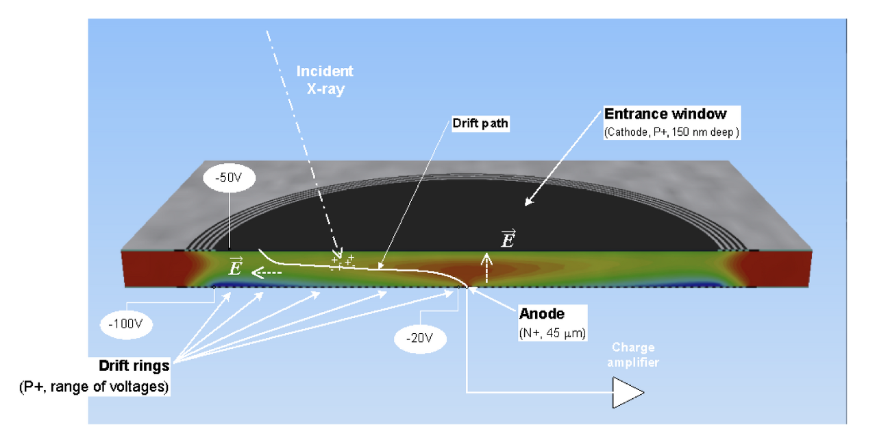 디스크 형태의 고저항의 실리콘 센서로 anode에 축적된 전압 신호로 변환하는 FET와 함께 사용됩니다. SDD센서는 정전용량이 매우 낮아 짧은 전자 처리 시간을 가져 매우 높은 계수율에서도 작동이 가능합니다. 또한 실리콘 드리프트 검출기는 누출 전류가 매우 낮기 때문에 Peltier cooling을 사용하여 냉각 시스템이 쉽게 도달할 수 있는 온도에서 최적의 성능을 달성할 수 있으므로 액체 질소가 필요하지 않습니다.