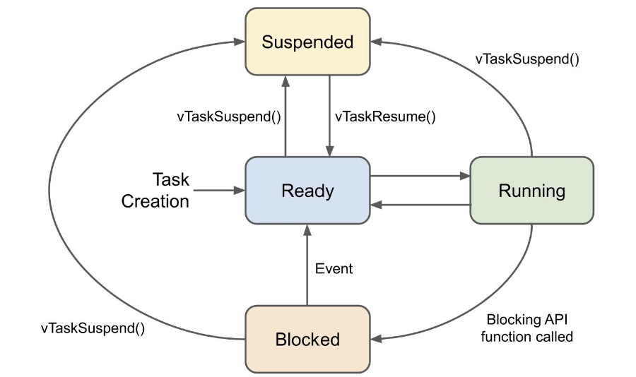 4) 수면 상태 : 수면 상태의 태스크는 일정 시간이 경과하거나 특정 이벤트가 발생할 때까지 실행을 중단합니다. 예를 들어 타이머 ISR은 타이머가 만료되었을 때 수면 상태의 태스크를 준비 상태로 전환합니다. (수면상태 -> 준비상태)