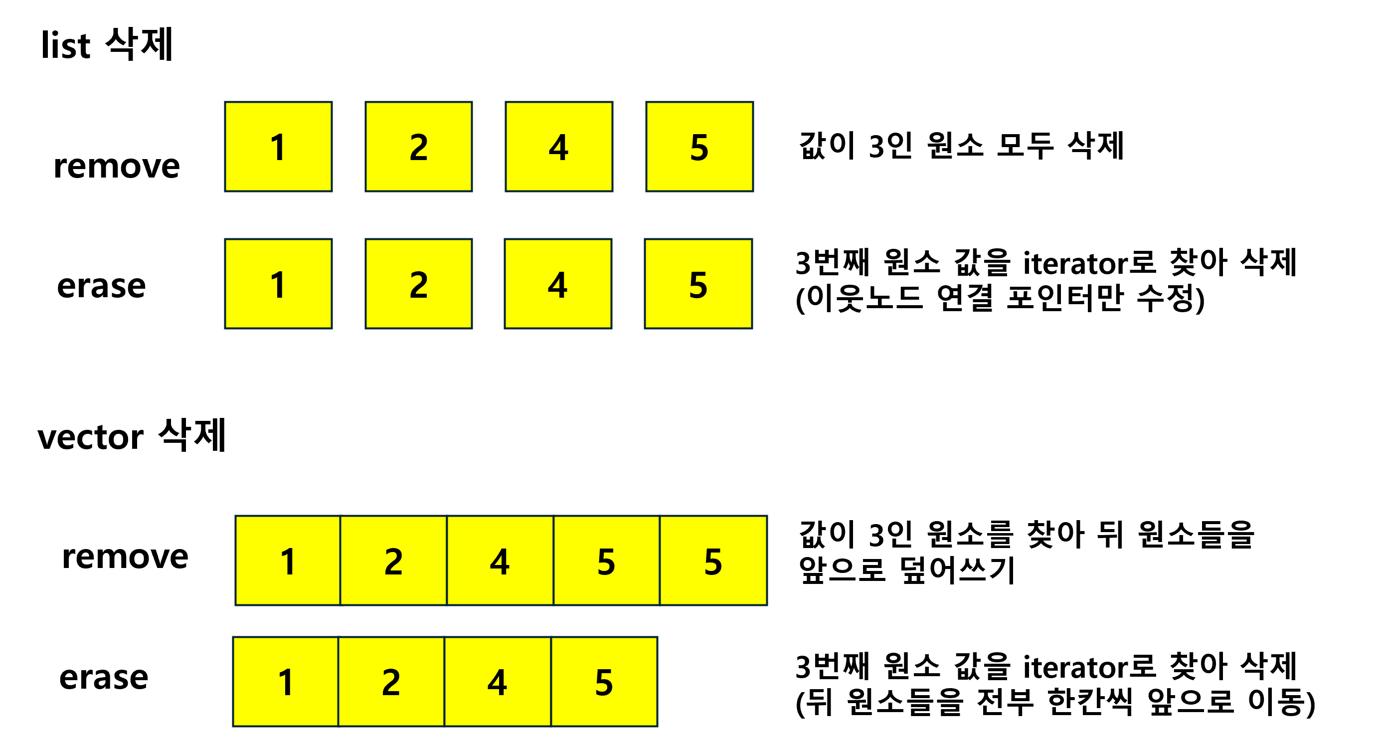 erase의 경우 정확히 특정 위치의 요소를 제거해야하기 때문에 vector와 list모두 iterator로 접근이 필요하며 값으로는 직접 접근해서 삭제할 수 없기 때문에 iterator로 지정한 위치의 원소를 삭제합니다. iterator로 위치를 지정해서 삭제한다는 공통점이 있지만 내부동작방식은 완전히 다릅니다. vector는 연속된 배열이기 때문에 삭제를 위해서는 뒤 원소들 전부를 한칸씩 앞으로 복사해야하기 때문에 비효율적으로 동작하게 됩니다. list의 경우 연결리스트이기 때문에 포인터만 수정하면 효율적으로 동작할 수 있습니다.